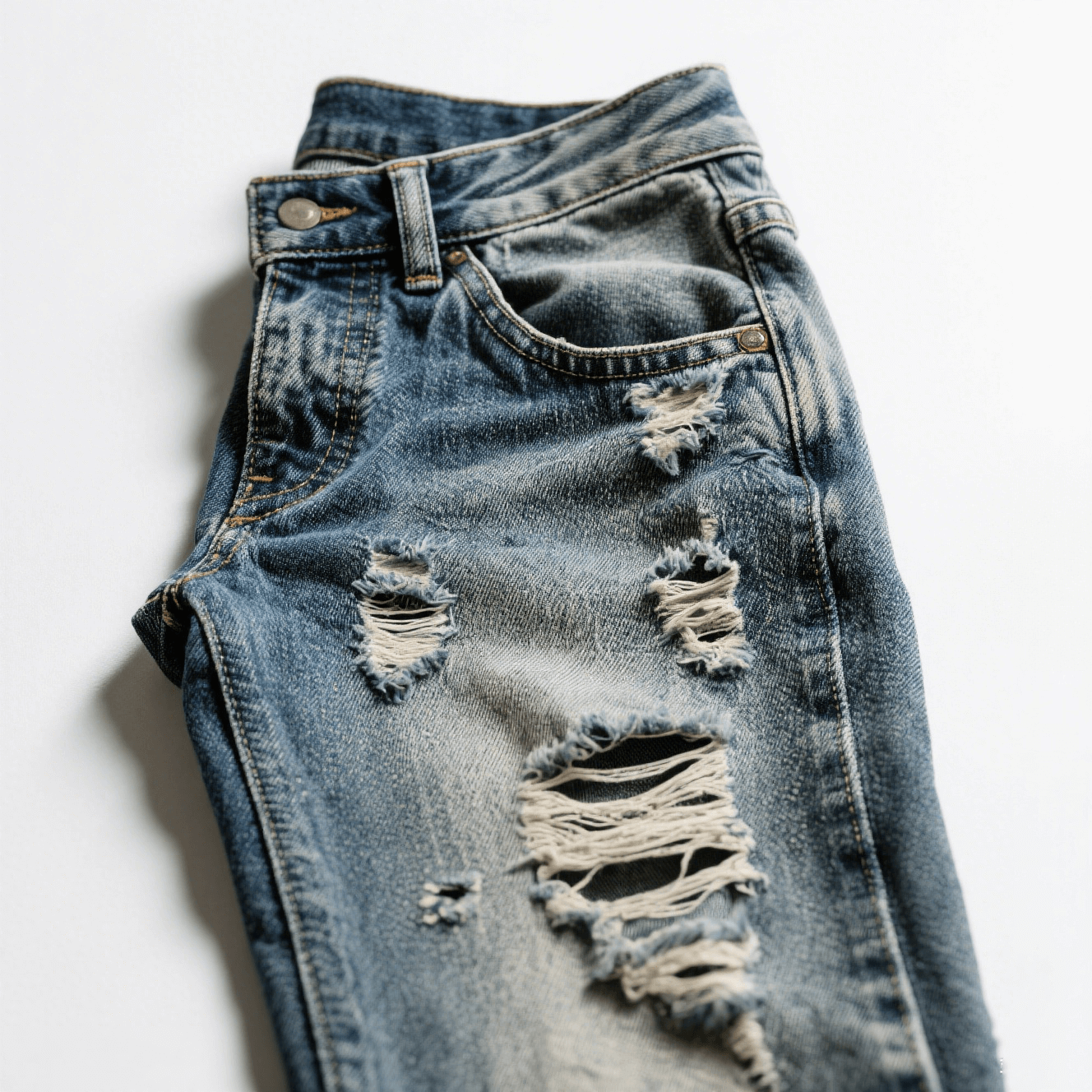 Intentional rips, frays, holes via cutting/laser for rugged, edgy vibes (punk/grunge); hand-distressed high-cost, machine-treated affordable, balances damage with fabric strength.