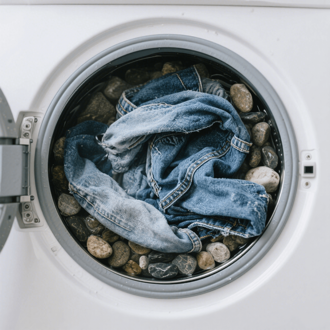 Abrasive stones + detergent scrub denim to soften fabric and create faded, worn look; suits casual/vintage styles, moderate cost, high water use, requires abrasion control.